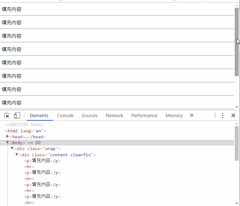 <div class="content"> <p>填充内容</p> <hr /> </div> <div class="footer"> <p>这是页脚@WiseWrong</p> </div>
