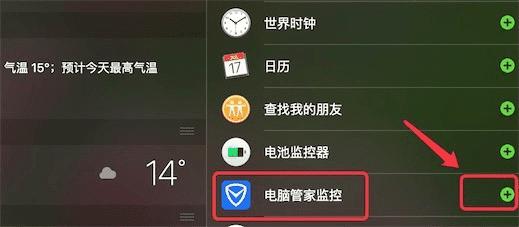 3、然后可以看到,在右边列出了可以添加的小控件,我们点击‘电脑管家监控’右边的加号图标。