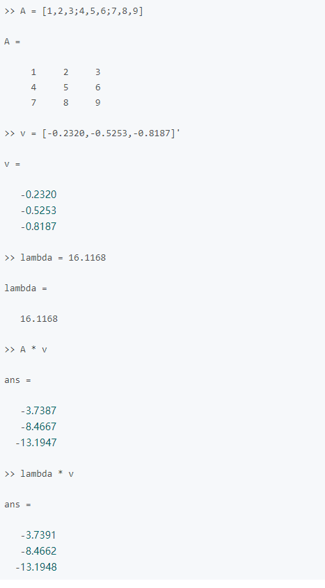 V中每一列都是一个特征向量,D中对应的值就是特征向量的特征值。第一列为例,特征值为16.1168,对应v中第一列特征向量。