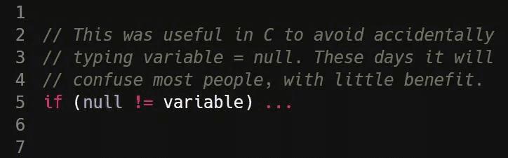 [译者注:图片中的注释内容:这在 C 语言中用于避免误写成 variable = null。最近它造成不少人困惑,但似乎并没带来多大好处]
