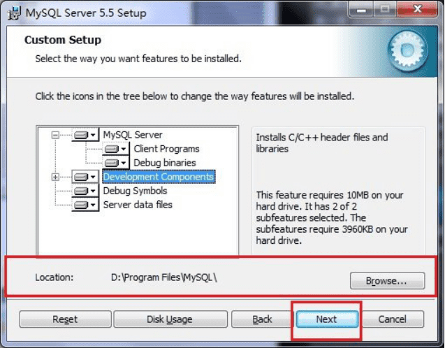 4、在出现自定义安装界面中选择mysql数据库的安装路径,这里我设置的是“d:\Program File\MySQL”,单击“next”继续安装,如图所示: