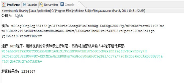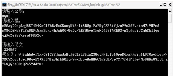 利用这个类的确可以很好的实现RSA的加解密,比如,在.NET端,构建一个公钥对应的BigInteger e、一个模对应的BigInteger n和一个明文对应的BigInteger m,然后执行语句BigInteger c=m.modPow(e,n),便可以实现加密操作,密文为c,这样的加密是标准加密,没有附加任何填充算法的加密。