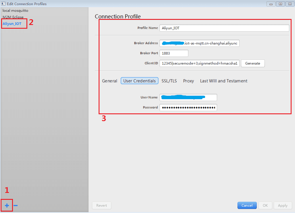 首先点击左下角的加号,添加一个命名为Aliyun_IOT的配置工程项,然后在该配置项中配置MQTT相关的一些参数。