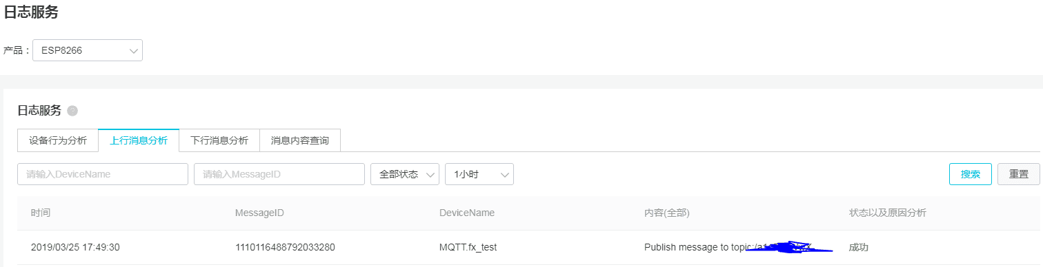 点击Publish,发送数据到物联网平台中。打开物联网平台设备的日志服务