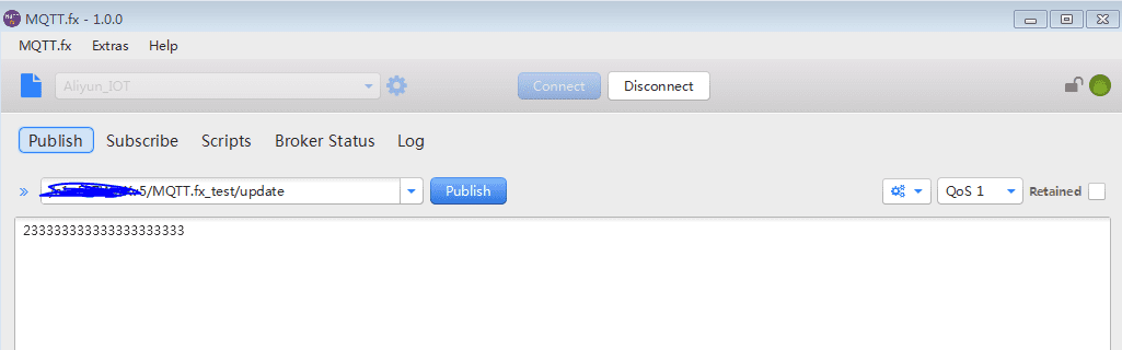 同理将Topic列表中的/×××××××××/MQTT.fx_test/update 中拷贝到MQTT.fx中