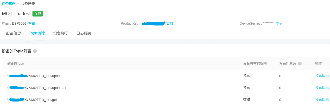 接下来我们实验一下物联网平台与MQTT.fx两者之间的订阅与发布消息。