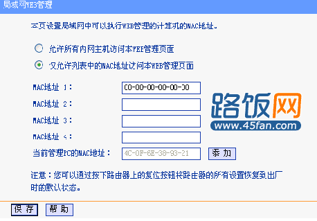 注意:可以设置多个MAC地址以WEB方式管理路由器,如果你想添加多个MAC地址,则只需要在MAC地址2、MAC地址3等相应添加。