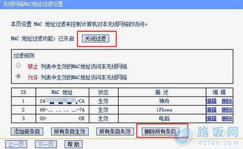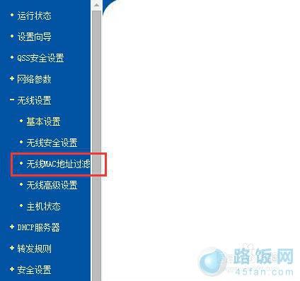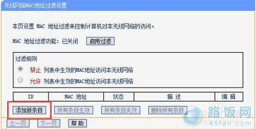 二招:在无线路由器页面的左侧栏目,点击打开无线设置栏目下的无线MAC地址过滤,这时,在页面的右侧将有一个无线MAC地址过滤的设置页面,点击左下角的添加新条目。
