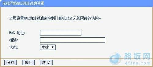 进入MAC地址的添加页面,在MAC地址栏目中输入每个设备所对应的物理地址,描述栏目可以写上每个设备所对应的名字,方便区分就行,状态栏选择生效,然后点击保存即可完成一个设备的MAC地址添加。