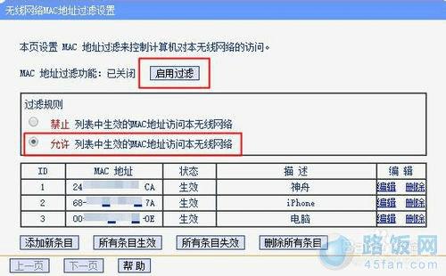 所有设备的MAC地址都添加完毕之后,点击上方的启用过滤按钮,过滤规则选择允许列表中的生效的MAC地址访问本无线网络,这样,以后就只有这列表里面的设备可以上无线网,别人知道WiFi密码了也别想蹭,如果家里有客人来,想上无线网,那么就麻烦一些了,需要将他们的MAC地址添加进去(文末有苹果、安卓、电脑的MAC地址查看方法)
