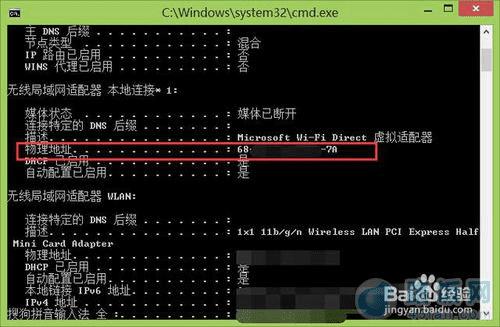 按住键盘上的Windows键加上R键,调用出运行窗口,输入cmd,然后敲一下回车键,进入cmd运行窗口,输入ipconfig/all,然后敲一下回车键,在无线局域网适配器本地连接下方,便可以看到电脑的物理地址了。