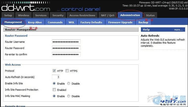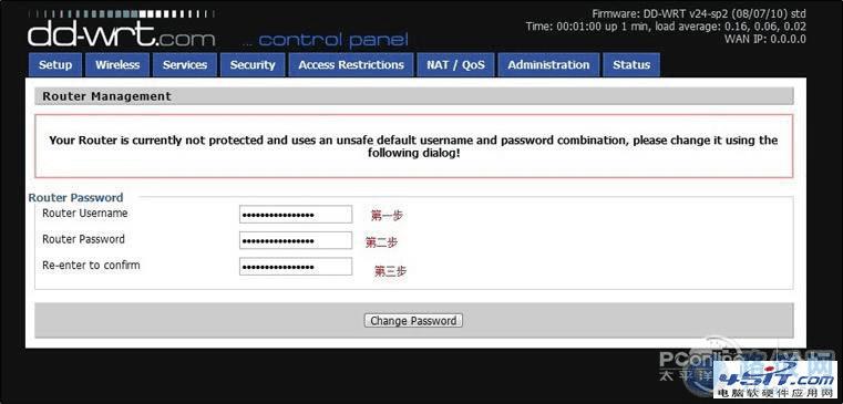 第五步:让我开始吧,变身已经完成等十分钟过去后,在浏览器地址栏中输入:一九二。一六八。一。一,进入DD-WRT界面。(如果输入后无效,先断开路由器电源,然后重新插上,然后再次进入即可)。在初始界面的三栏中均输入“admin”,然后点击“***gepassword”按钮。出现输入密码的验证页面,用户名以及密码栏中均输入“admin”即可。如图六