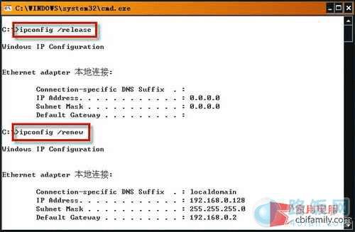 点击“开始”菜单→“运行”,输入“cmd”运行“命令提示符”,输入:“ipconfig /release”命令并回车。这个命令的作用是:释放全部(或指定)适配器的由DHCP分配的动态IP地址。然后我们再输入“ipconfig /renew”命令并回车,该命令的作用是:为全部(或指定)适配器重新分配IP地址。这样路由器就会重新为你的电脑分配一个空的IP地址,避免了和其他电脑的IP地址发生冲突。运行这两个命令后,我们的系统就可以正常上网了。