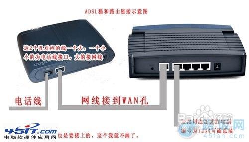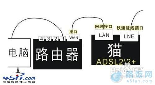 首先进行连线:电话入户线——宽带分离器——猫DSL口——路由器的线一头插在猫的LAN口上,另一头插在路由器的WAN口上——电脑(分别两条线都插在路由器的LAN口上)。需要注意,如果是ADSL宽带,那么电话要从宽带分离器的专用接口上连接。