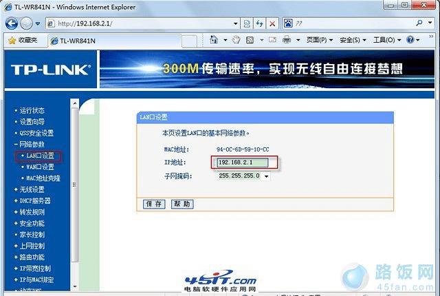 首先,由于HG330和TP-Link路由器默认地址都是192.168.1.1,需要将台式机的网线直接连接到TP-Link路由器的LAN接口,然后在浏览器中键入192.168.1.1,输入用户名和密码(默认是admin,admin),进入TP-Link路由器管理界面。修改LAN口设置,其中IP地址修改为不与HG330默认值冲突的地址(如:192.168.2.1),子网掩码改为255.255.255.0,保存设置(如图1)。
