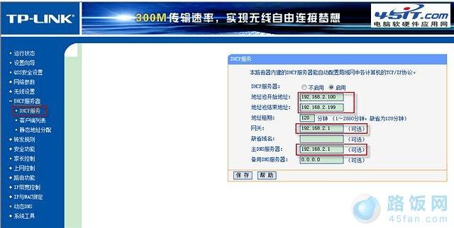 最后修改DHCP服务器->DHCP服务,将地址池开始地址和结束地址分别填写为192.168.2.100和192.168.2.199(注意前三个字段需要和LAN口的IP地址一致),网关和主DNS服务器都填写为LAN口的IP地址192.168.2.1。保存设置(如图3)。