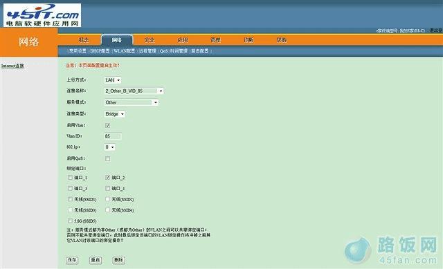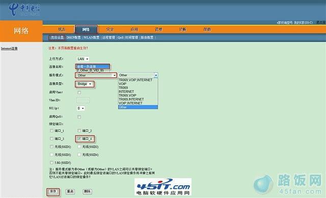 我们首先需要修改的是网络->宽带设置。我的默认有三个设置,查看发现2_Other_B_VID_85绑定了端口2为IPTV,所以不要动这个设置,将其他的设置(1_TR069_VOIP_R_VID_46[这个和电信远程控制(TR069)以及电话(VOIP)有关]和3_INTERNET_R_VID[这个和上网有关])删除。然后在连接名称中选择“新增一条连接”,服务模式选择“Other”,连接类型选“Bridge”,绑定端口选择“端口4”(不与IPTV端口冲突即可,之后从HG330的该端口引出一根网线连接TP-Link路由器的WLAN端口),点击保存(如图8)。