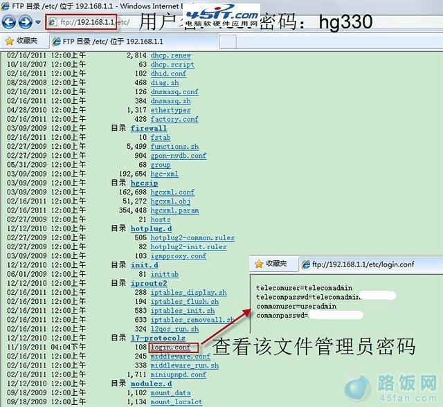 接下来用有线网络连接HG330路由器的任何一个LAN端口(注意不要连接IPTV的LAN端口)然后对HG330路由器进行设置。如果你没有HG330路由器的超级管理员账户和密码,可以打电话给10000找电信工作人员要。如果不给的话也可以用下面的方法进行破解。破解的方法很简单,由于HG330路由器默认开通的FTP端口,而且网上也有很多文章提到其默认的用户名和密码为root和hg330,这样就可以在IE中用FTP进入HG330路由器的目录(注意:部分其他浏览器可能看不到FTP的文件,所以建议使用IE浏览器)。在IE浏览器里输入ftp://192.168.1.1,会弹出用户名和密码框,填入用户名root和密码hg330,然后就可以看到里面的目录和文件了。在/etc目录下找到login.conf文件并点击打开它(右键可能没法下载该文件),可以看到你的HG330无线路由器的超级管理员账号和密码以及你的无线网络的账户和密码(一般用户名为telecomadmin,密码为telecomadmin******** [*为数字]。如图4)。将这些账户和密码复制并保存到本地文件中以防止遗忘。(我当时就是修改了一些参数之后登陆不进去了,而且在IE中输入ftp://192.168.1.1也不能查看login.conf文件,后来用了另一台机器才找回超级管理员账号和密码)。