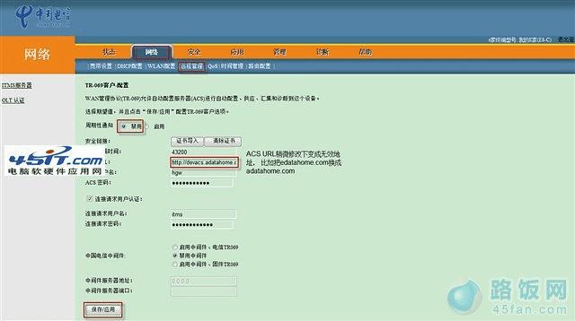 为了防止电信远程修改HG330路由器参数,需要修改网络->远程管理参数,将ITMS服务器中的周期性通知禁用,将ACS URL稍微修改下变成无效地址, 比如把edatahome.com换成adatahome.com(如图10),保存设置。