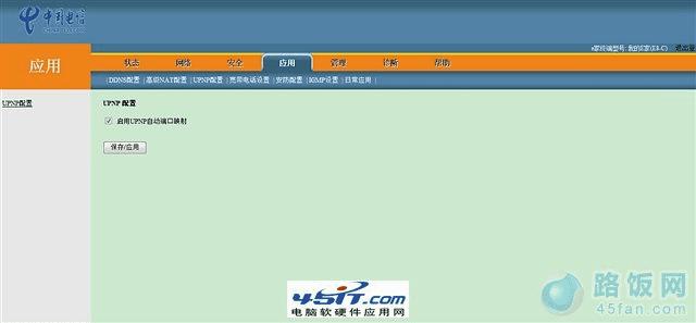 网络参数设置到此就大功告成了。如果你经常用一些P2P的下载软件(如BT等),可以开启UPND端口映射,网上传言开启之后对长时间下载的下载速度有帮助。在“应用->UPNP配置”里勾选“启用UPNP自动端口映射”(如图11)。