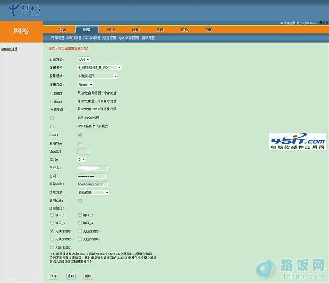 接下来修改TP-Link的WLAN口设置,WAN口连接类型选择PPPoE,填入电信的上网账号和口令,选择自动连接并保存(如图2)。