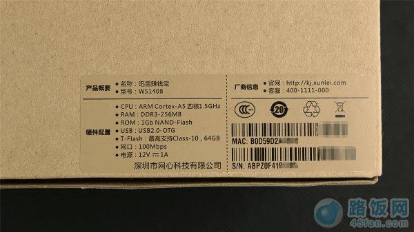 牛皮纸盒包装很简洁,正面只有迅雷的logo,背面是机器的参数信息。赚钱宝分为白色版和黑色版,而我们这次拿到的是白色版。