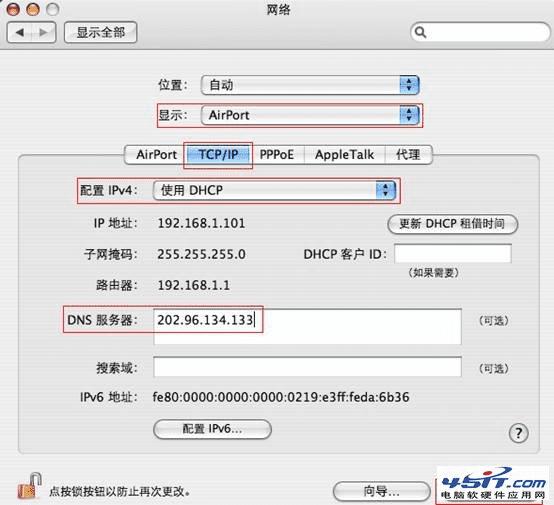 选择桌面图标“System Preferences”。在弹出的页面中选择“网络”。弹出网络连接设置页面,如下图所示,“位置”选择“自动”,“显示”选择“AirPort”,选择“TCP/IP”,即可设置无线网络参数(推荐使用DHCP)。
