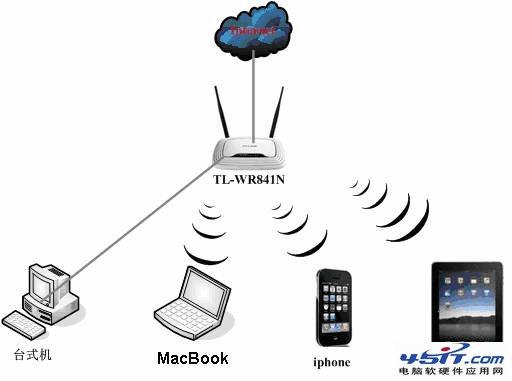 说明:无线路由器相当于一台有线路由器加一个无线发射的小型“基站”,可以同时满足有线电脑、无线的笔记本、平板电脑等终端同时接入共享宽带上网。