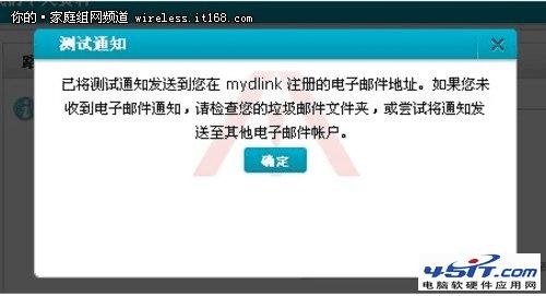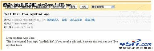 如果看到上图所示的界面,则说明邮箱设置正常。并且打开mydlink帐户邮件是可以看到测试邮件的,如下图所示: