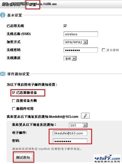 如果有其他无线用户蹭网怎么办?我怎么能在第一时间就知道,就将其“驱逐出境”,这可以用到邮件通知功能。