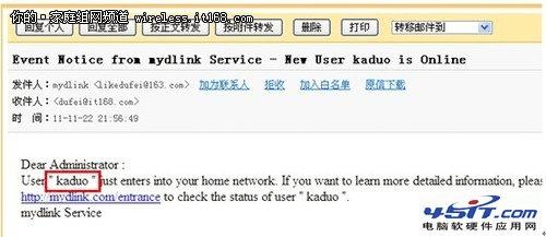 发现有一封新邮件,大体意思是:发现有一个kaduo的用户刚刚连接到你的网络中,可以在http://mydlink.com/entrance中查看信息信息。
