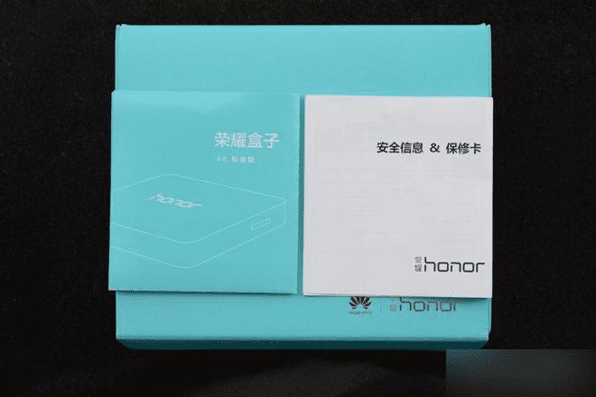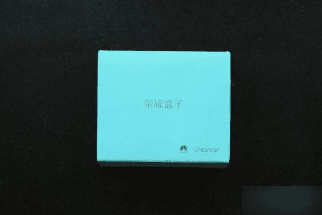 荣耀盒子采用了蓝色外观的纸质包装,“荣耀盒子”的产品名称在正面的最正中,右下角则是华为和荣耀的Logo。