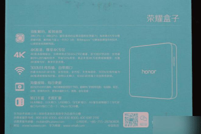 而包装盒的背面,则详细表述了荣耀盒子的各项具体参数。