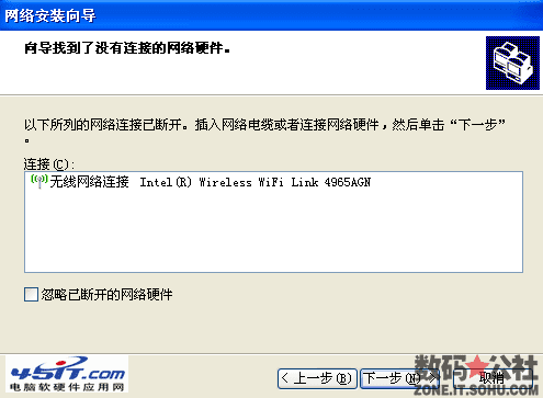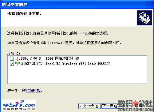 这里选择你的无线网卡,点击下一步,后一个会叫设置计算机描述 以及名称。填上 点下一步 又有个设置工作组名 设置好 点下一步 然后选择 "关闭文件和打印机" 点下一步