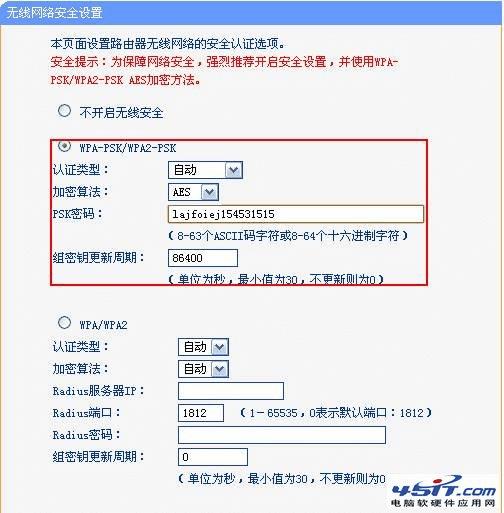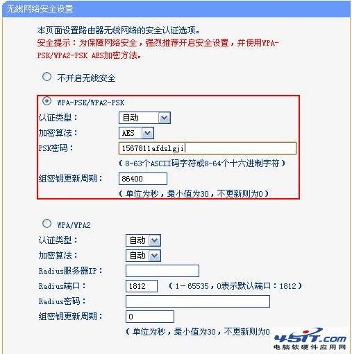 3. 打开菜单"无线设置2.4GHz"——"无线安全设置",设置与TL-WDR4310 A相同的无线安全,安全类型选择"WPA-PSK/WPA2-PSK",加密算法选择"AES"并输入与TL-WDR4310 A在2.4GHz频段相同的PSK密码,点击"保存",如下图所示。此时2.4GHz频段的无线漫游已经设置完成。