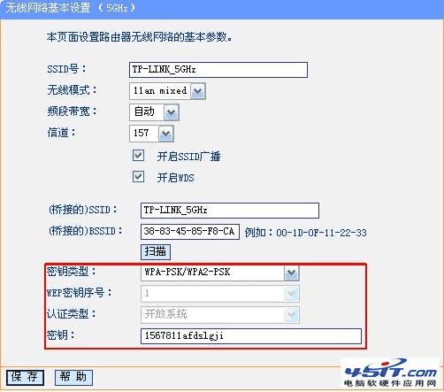 TL-WDR4310 B设置2.4GHz及5GHz频段基本信息及无线安全,并在5GHz频段开启WDS桥接前端A路由器。