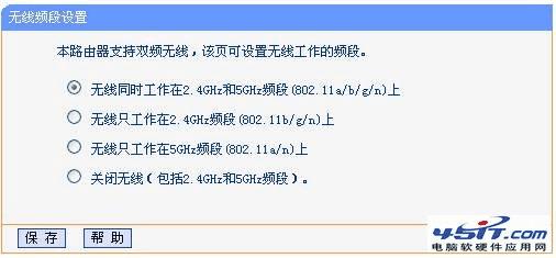 1. 打开TL-WDR4310 B的设置页面(默认192.168.1.1),打开菜单"无线频段设置",选择"无线同时工作在2.4GHz和5GHz频段上",点击"保存"。