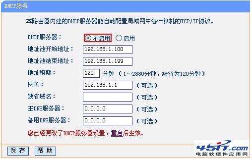 打开TL-WDR4310 B的设置页面(默认192.168.1.1),打开菜单"DHCP服务器",选择"不启用",点击"保存"并重启路由器,如下图所示。
