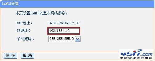 打开TL-WDR4310 B的设置页面(默认192.168.1.1),打开菜单"网络参数"—"LAN口设置"将IP地址改为"非192.168.1.1"(本例中修改为192.168.1.2),点击"保存",如下图所示。