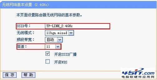 2. 打开菜单"无线设置2.4GHz"——"基本设置",设置TL-WDR4310 B的无线SSID,设置与TL-WDR4310 A 2.4GHz频段相同的SSID"TP-LINK_2.4GHz",为了避免与A路由器产生无线干扰,信道选择与TL-WDR4310 A不会干扰的信道(此例选择11),点击"保存",如下图所示。