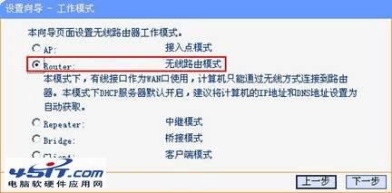 2、设置工作模式。点击"下一步"开始设置,弹出工作模式设置页面,选择"无线路由模式"如下图所示。
