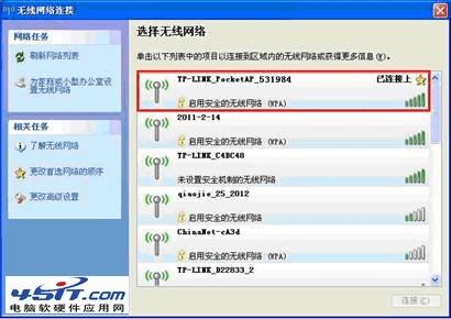 6、此时TL-WR700N的无线网络已经设置了无线安全,笔记本的无线网络连接会自动断开,需要重新连接TL-WR700N的无线网络(本例中SSID为TP-LINK_PocketAP_531984),连接过程中需要输入TL-WR700N的无线PSK密码(本例为123456789),连接上之后,如下图所示。
