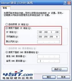 在"电脑桌面—开始—控制面板—网络连接"页面中,选择"无线网络连接"的图标,点击右键,选择"属性",按下图的信息将无线网卡的IP地址指定为192.168.1.100并保存。