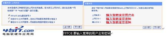 4、设置上网方式。一般常见上网方式包括PPPOE、动态IP、静态IP,本例以最为常见的PPPOE拨号上网为例。点击"下一步",弹出上网方式选择页面。
