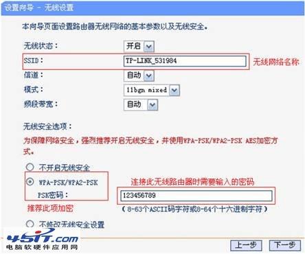 注意:SSID即为您无线连接时搜索到的名称(用来区别其他无线路由器),无线名称SSID建议设置为字母或数字的组合,尽量不要使用中文、特殊字符,避免部分无线客户端不支持中文或特殊字符而无法连接。为防止非法用户蹭网,建议设置无线安全,推荐选择"WPA-PSK/WPA2-PSK"并设置密码(本例为123456789),如果忘记请有线连接路由器,在"无线设置"中查看。