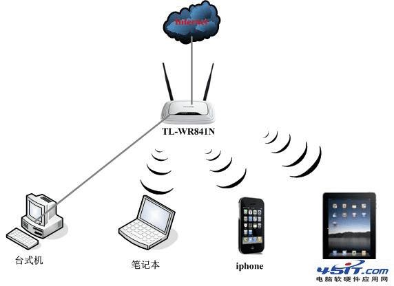 说明:无线路由器相当于一台有线路由器加一个无线发射的小型“基站”,可以同时满足有线电脑、无线的笔记本、平板电脑等终端同时接入共享宽带上网。