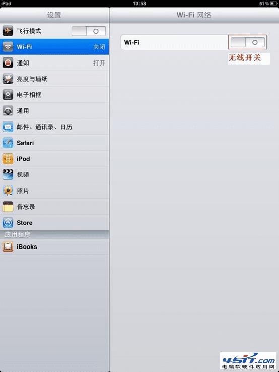 STEP1:打开IPAD主界面,选择“设置”菜单,进入WIFI设置页面。