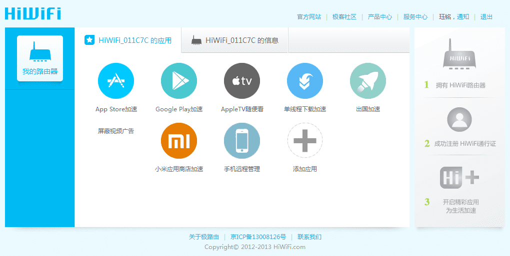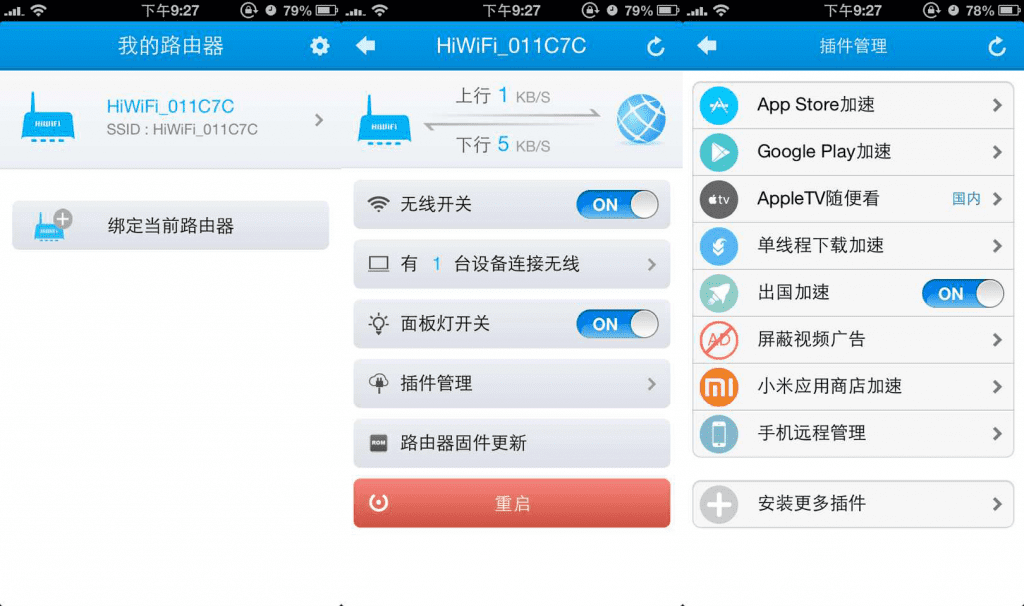 ▲支持应用是这款路由器最大的特色,默认安装有:App Store加速、Google Play加速、出国加速、屏蔽视频广告、小米应用商店加速、手机远程管理。绑定了HiWiFi账号之后还能添加其它应用。