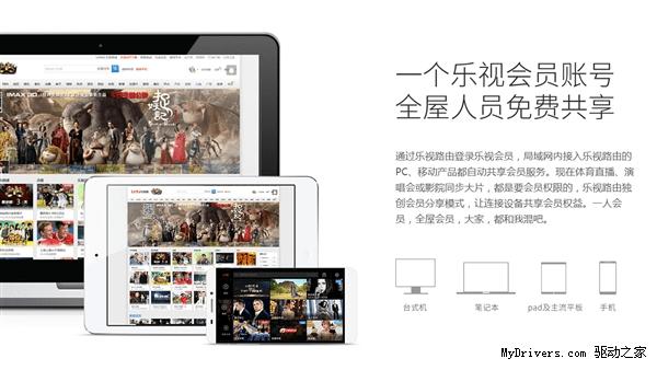 乐视路由器主打共享功能,官方称之为“全球首款支持会员共享的智能路由器”。用户只要登录乐视会员,局域网内接入乐视路由的PC、移动产品都自动共享会员服务,同时享有4大独享权益,包括超过1000部会员独享影视库;1080P高品质内容;云端加速高优先级,响应快流畅不卡顿;播放无广告。