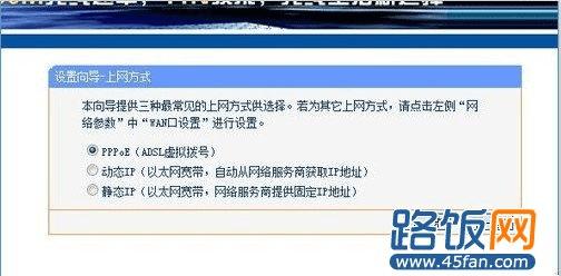 4、现在进入了上网方式设置页面,可以看到有三种上网方式的选择,要注意了如果你家使用的是电话线拨号上网就选择PPPoE(ADSL虚拟拨号)动态IP一般电脑直接插上网络就可以用的,上层有DHCP服务器的。静态IP一般是专线什么的,也可能是小区带宽等,上层没有DHCP服务器的,或想要固定IP的。小编就以比较常见的拨号上网方式为例设置无线路由器,然后点击“下一步”。